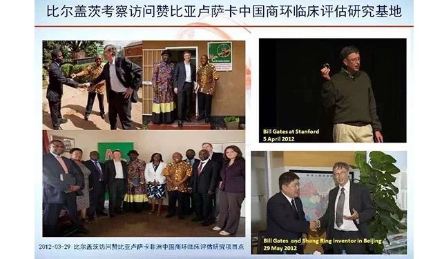 李石華團(tuán)隊(duì)的獨(dú)立臨床數(shù)據(jù)非常寶貴,也得到了蓋茨基金會的重視。2009年開始,蓋茨基金會開始支持李石華團(tuán)隊(duì)的獨(dú)立臨床試驗(yàn),并幫助商環(huán)完成了WHO的組織數(shù)年的反復(fù)論證和二級升級審查。比爾·蓋茨也親自參與到這項(xiàng)工作中來,2012年3月份,比爾·蓋茨前往非洲贊比亞的商環(huán)臨床應(yīng)用基地,向當(dāng)?shù)蒯t(yī)生了解技術(shù)細(xì)節(jié),并詢問了病人的臨床感受。4月,在美國斯坦福大學(xué)的演講中,比爾·蓋茨再次將商環(huán)作為典型的創(chuàng)新案例,向全校師生介紹。5月29日,比爾·蓋茨在北京與商建忠會見洽談。在2007年與世界首富擦肩而過后,商建忠終于見到了一直在背后支持自己的美國人。