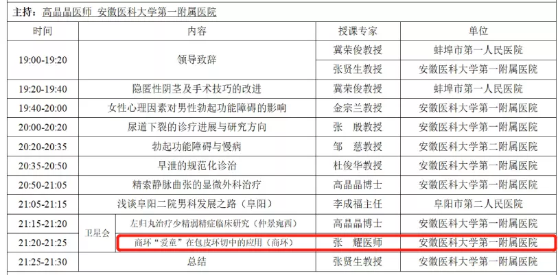 安徽醫科大學第一附屬醫院男科主任、全球華人男性及性醫學會副主席、中國性學會副會長、商環包皮環切培訓中心主任張賢生教授,安徽醫學會男科學分會秘書、安徽省性學會理事、秘書、商環包皮環切培訓中心秘書長高晶晶教授,安徽醫學會男科學會青年委員、安徽性學會理事、安徽省性學會性醫學專業委員會常委杜俊華教授等出席了開幕式。張賢生教授致開幕辭,他堅信,通過專家授課、實踐指導、科研共享等教學模式,不斷組建和培養我省男科菁英醫師隊伍,不斷提高我省男科診治的水平。
