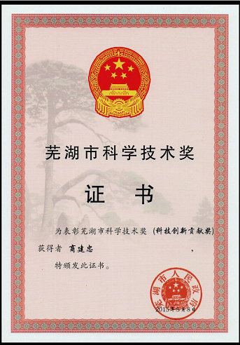 為貫徹落實全國、全省科技創新大會精神,推進自主創新建設,表彰企業及個人在科技創新領域新成果,2015年5月11日蕪湖市科技創新大會在蕪湖市政府隆重召開,蕪湖圣大醫療器械技術有限公司董事長、商環發明人商建忠先生憑借商環技術為人類生殖健康所作出的貢獻,榮獲個人最高獎項——蕪湖市科學技術獎(科技創新貢獻獎)。