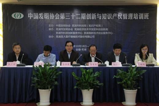 中國發明協會第三十二期創新與知識產權培訓班于2016年10月18-21日在蕪湖市成功舉辦,中國發明協會常務副理事長兼秘書長余華榮出席開班儀式,蕪湖市科技局局長楊少華,副局長李廣平,安徽信息工程學院黨委書記汪奇燕、蕪湖市發明協會會長李榮生等領導參加開班儀式。