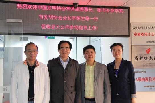 培訓期間,余華榮常務副理事長在蕪湖圣大醫療器械技術股份有限公司考察,右二為企業創始人、發明人商建忠,左一為蕪湖市發明協會會長李榮生,右一為蕪湖高新技術創業服務中心主任張元。